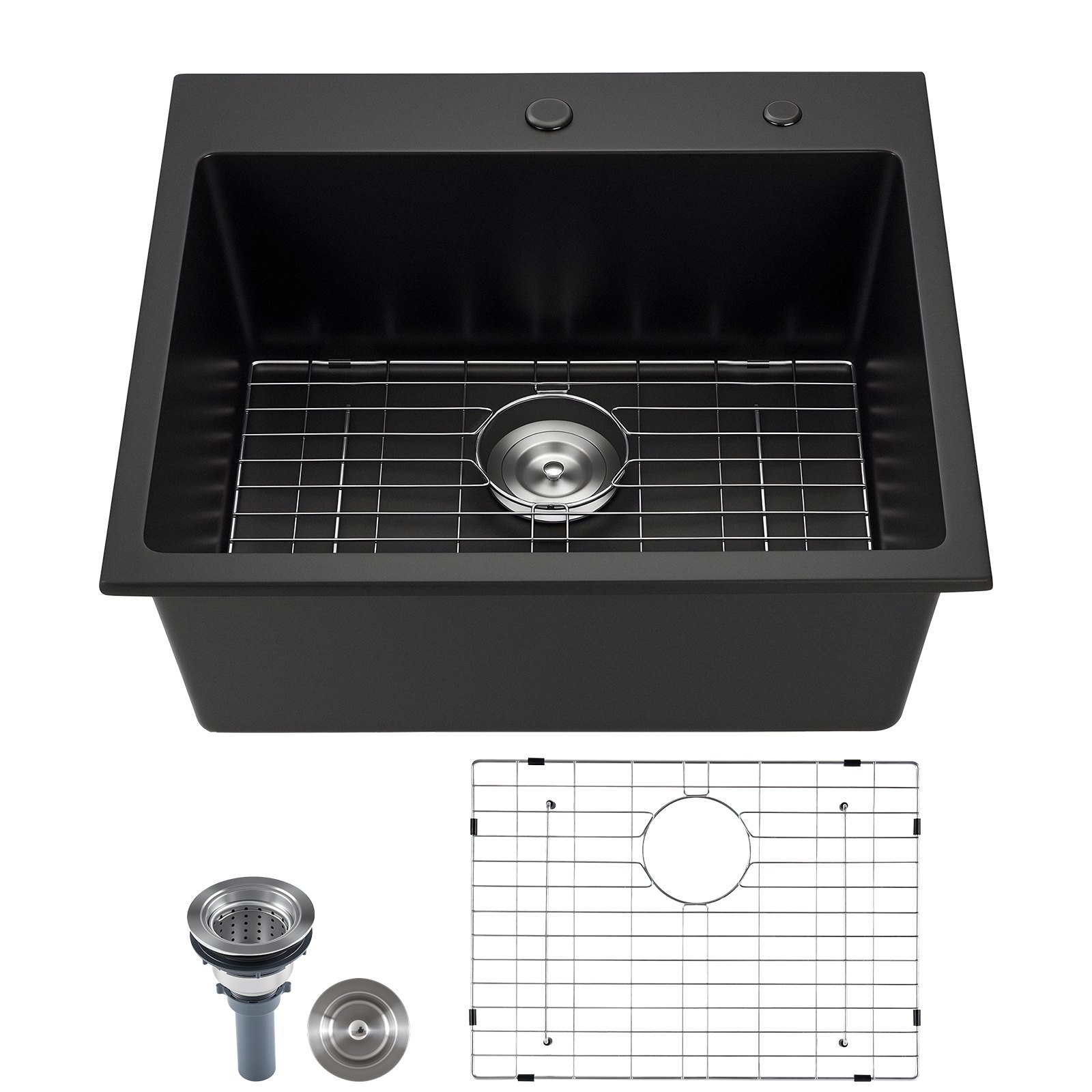 Multi-Part Kit for Granite Kitchen Sink: Grid reduces scratch and dampens noise; drain kit with filters catches debris for rapid water flow; silicone stopper forms a tight seal, keeping the top mount kitchen sink fresh and cutting standing water