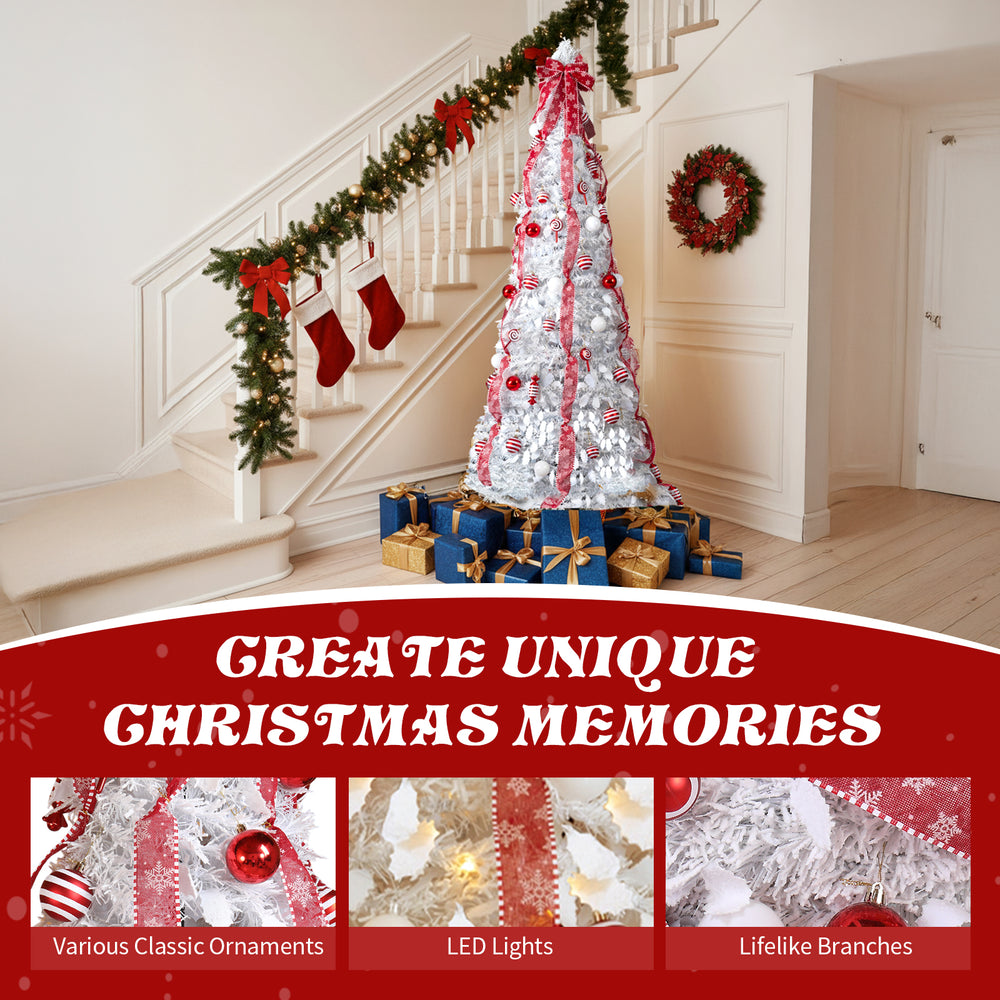 1. Fully Decorated: This fully decorated pop-up Christmas tree takes the stress out of holiday decorating. With its lifelike branches adorned with various styles of balls, white leaves, twinkling fairy lights, candies and ribbons, it brings festive magic to your space in seconds—no additional decor needed.